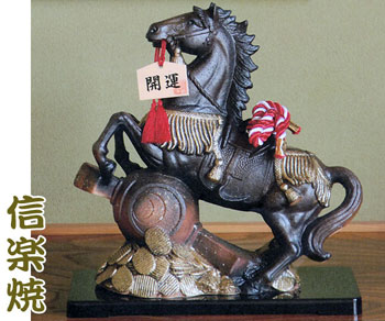 1200年の伝統を持つ信楽焼の作品です。小槌と小判をあつらえた躍動感のある作りです。  品番 uma-10