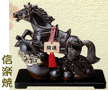 1200年の伝統を持つ信楽焼の作品です。縁起の良いひょうたんと開運札を付けた開運俊馬。力強く駆け抜けていく様子を再現しました  品番 uma-13