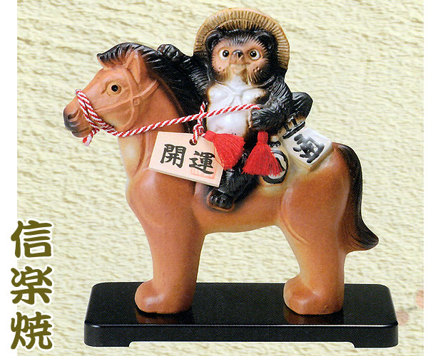 1200年の伝統を持つ信楽焼の作品です。かわいらしい狸が乗った開運狸馬。午と狸で運気アップ間違いなし☆  品番 uma-26